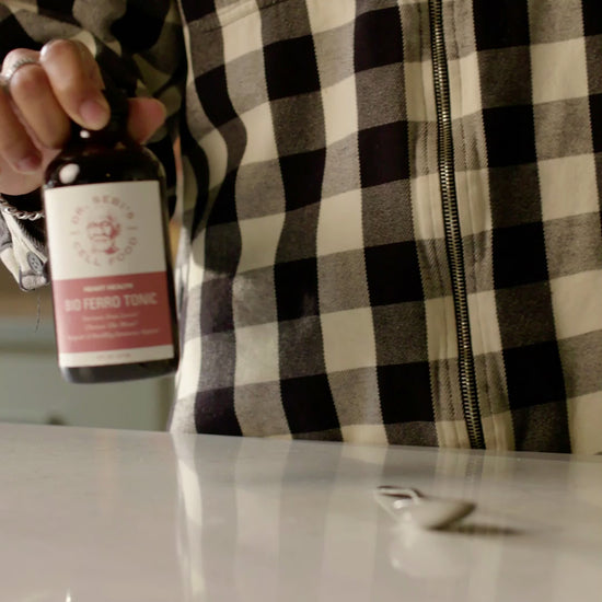 Reach optimal health and vitality by cleansing and nourishing the blood with Dr. Sebi's Bio Ferro Tonic. Saturated with minerals and bioactive plant compounds, this liquid formulation provides deep cellular nutrition and blood-cleansing benefits. Elderberry’s rich indigo-blue flavonoids reduce inflammation. Chaparral, used traditionally for arthritis, helps remove toxins from the blood. Burdock’s deep roots cleanse the blood, delivering oxygenating iron as it nourishes and purifies the blood. Yellow Dock supports the circulatory system, reducing inflammation and blood pressure. Anti-inflammatory Cocolmeca promotes waste excretion and protects against cholesterol oxidation. Muicle helps cells respond to insulin, aiding blood sugar balance. Blue Vervain promotes restorative immune functions and reduces stress. Encino contains antioxidants targeting blood vessel inflammation.
